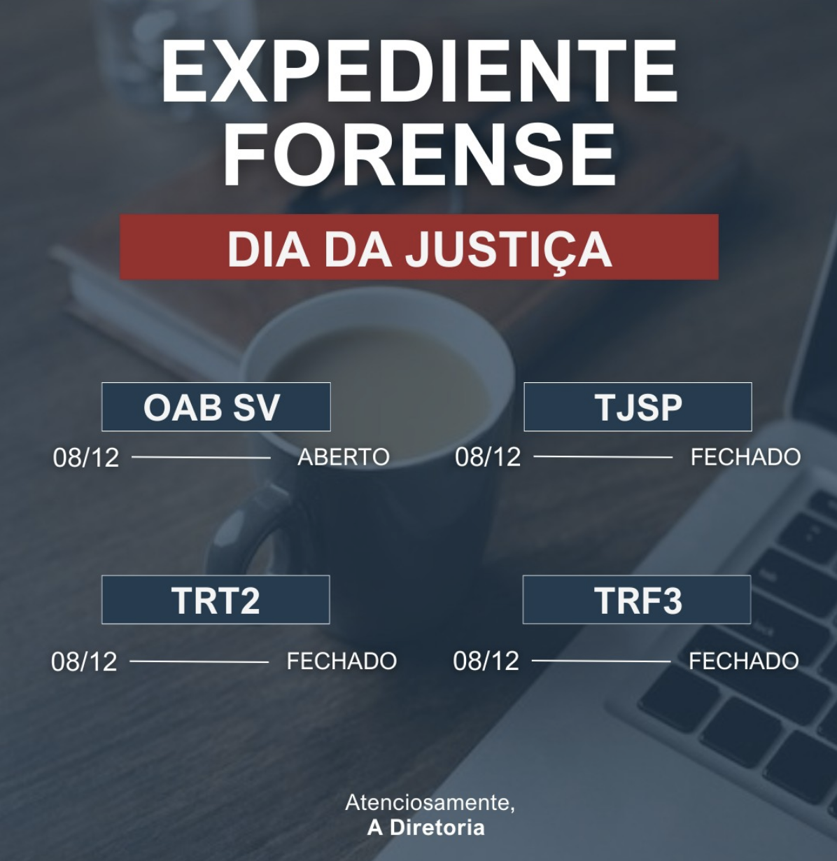 Expediente no dia 08 de Dezembro de 2025 - Dia da Justiça