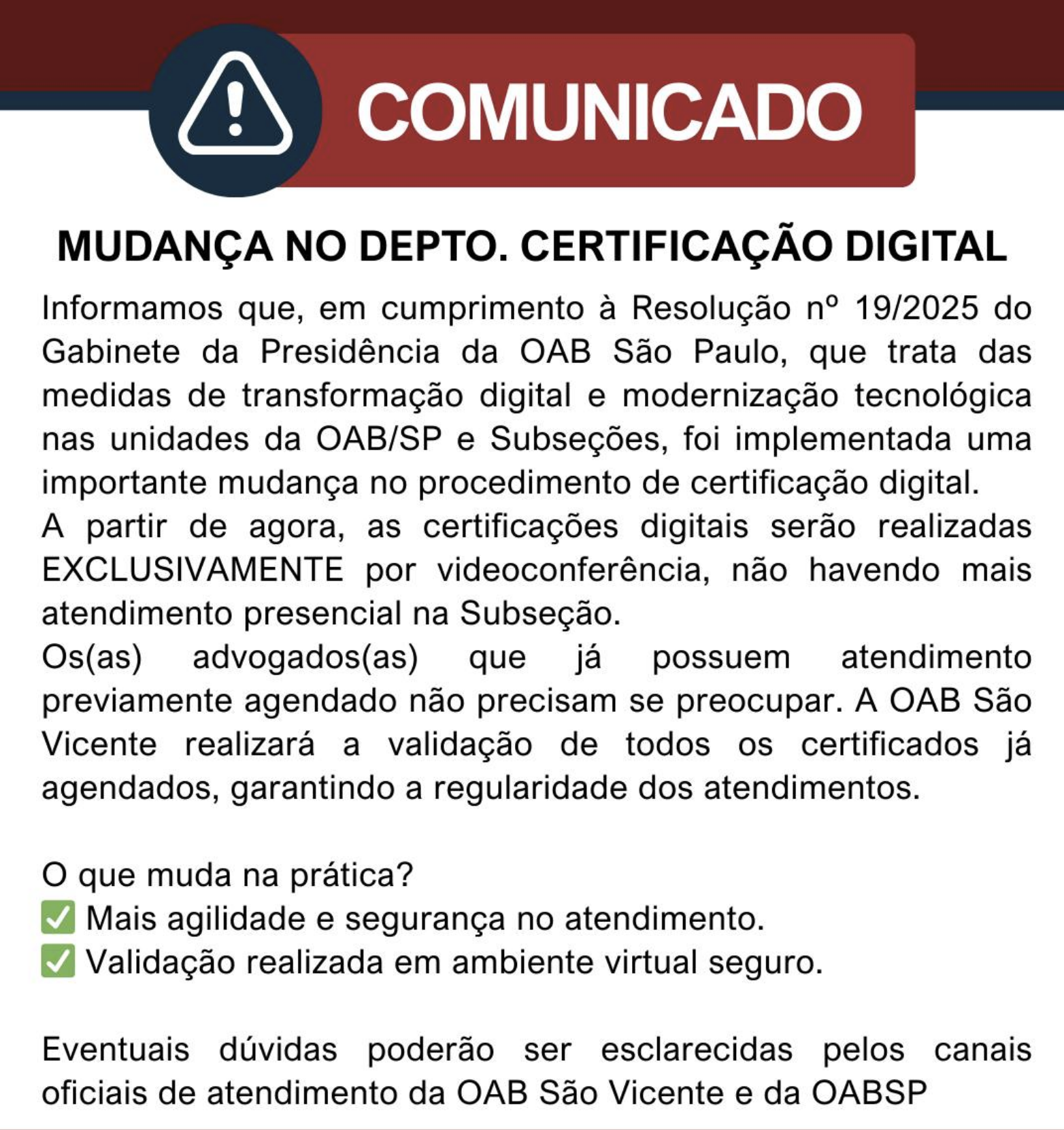 Informamos que, em cumprimento à Resolução nº 19/2025 do Gabinete da Presidência da OAB São Paulo, que trata das medidas de transformação digital e modernização tecnológica nas unidades da OAB/SP e Subseções, foi implementada uma importante mudança no procedimento de certificação digital.
