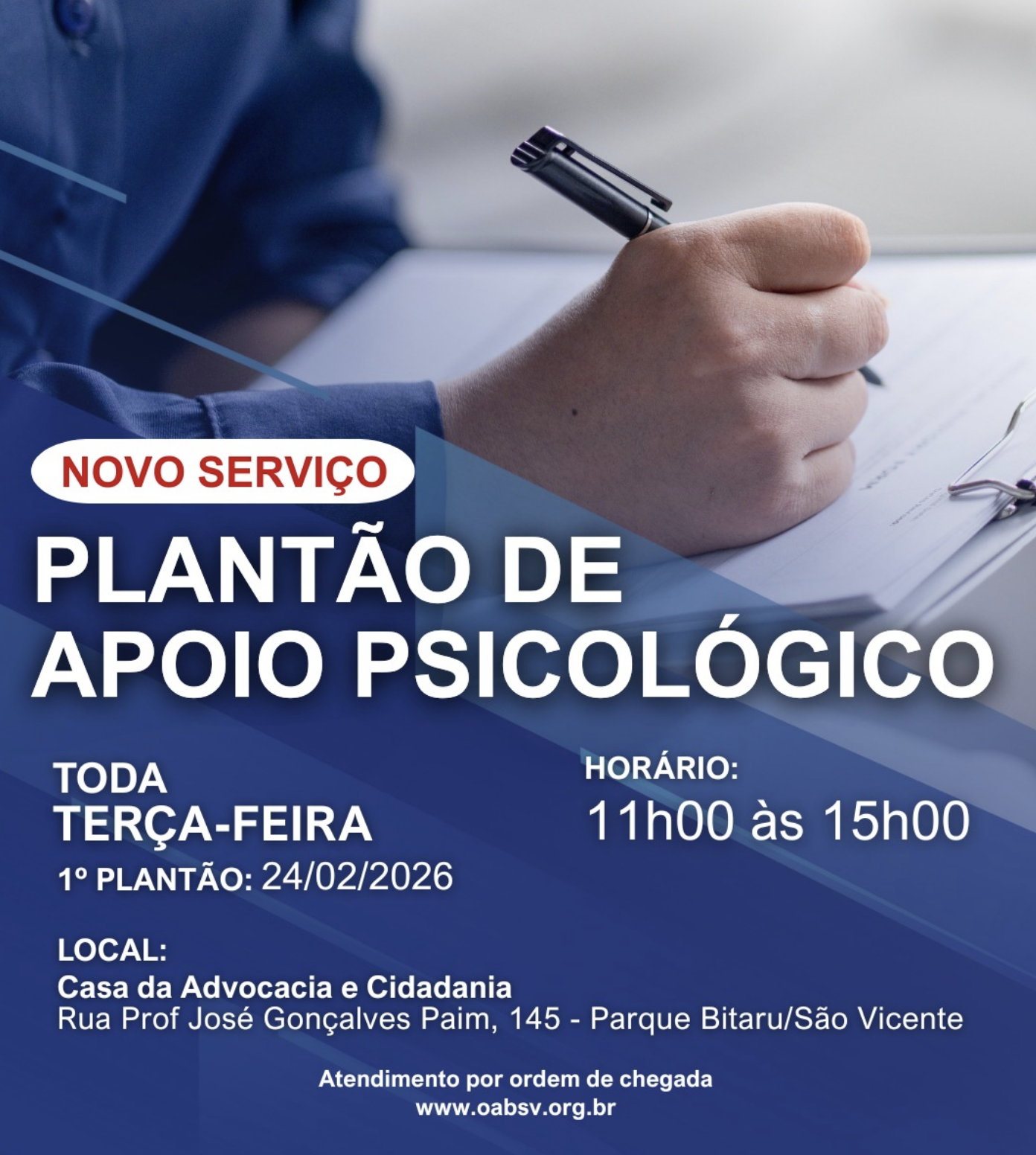 A OAB Subseção São Vicente inicia um novo serviço de Plantão de Apoio Psicológico, oferecendo um espaço de escuta, acolhimento e orientação.